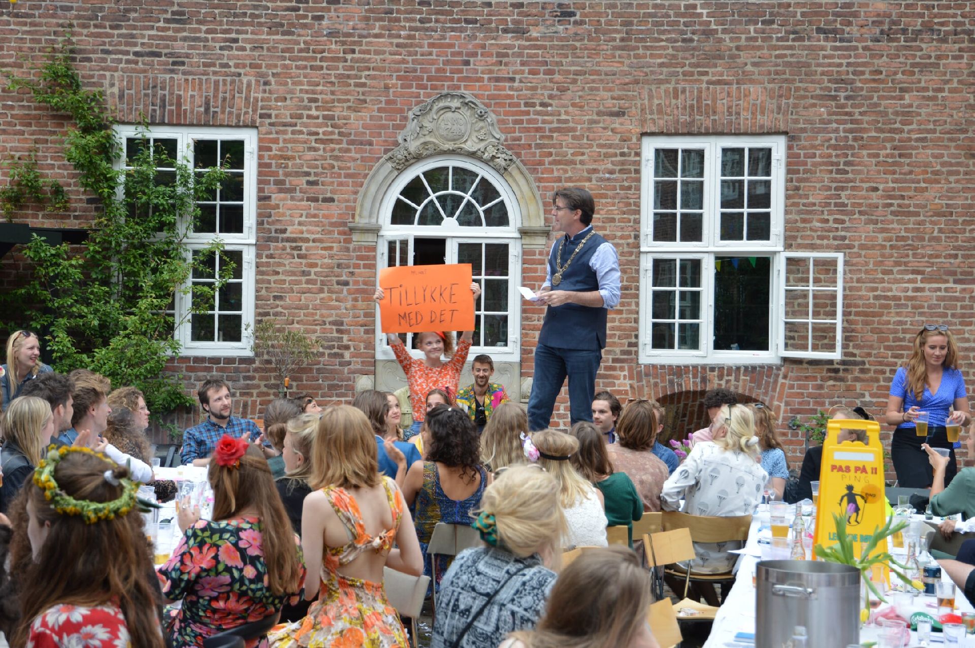 The Linden Lunch is one of the six large yearly parties. It happens in May and stands out from the other parties as it takes place primarily during the day. Lunch is eaten in the yard, with fingers crossed for good weather. The schnaps flows freely and at 5pm, the Regensians run up the Round Tower and sing the Regenssong at its top. Traditionally, this is followed by a large water fight and a communal shower for those who fancy, and smaller spontaneous parties spread across the rooms and kitchens. Finally, the ones who still have energy to spare meet in Lille Sal to dance until they drop.